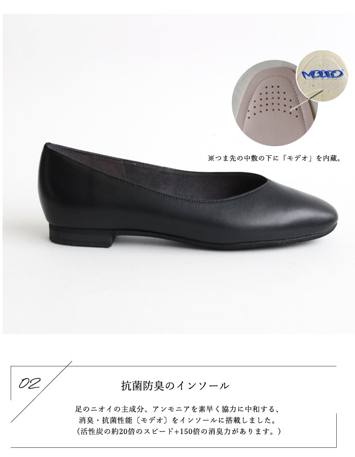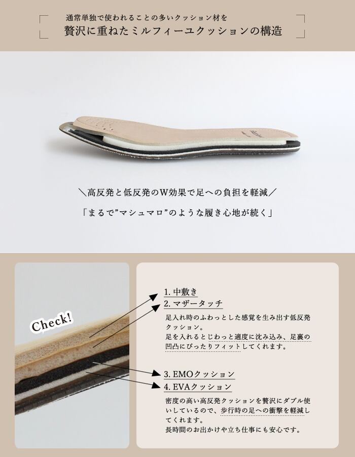 シンプルで足なじみの良い日本製レザーシューズ。インソールには4層に重ねたふわふわクッションを使用し、歩行時の足への衝撃を軽減。気になる消臭・抗菌性能も搭載しています。