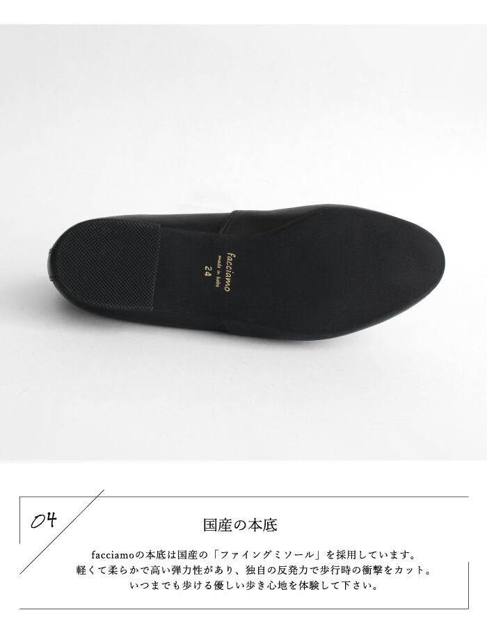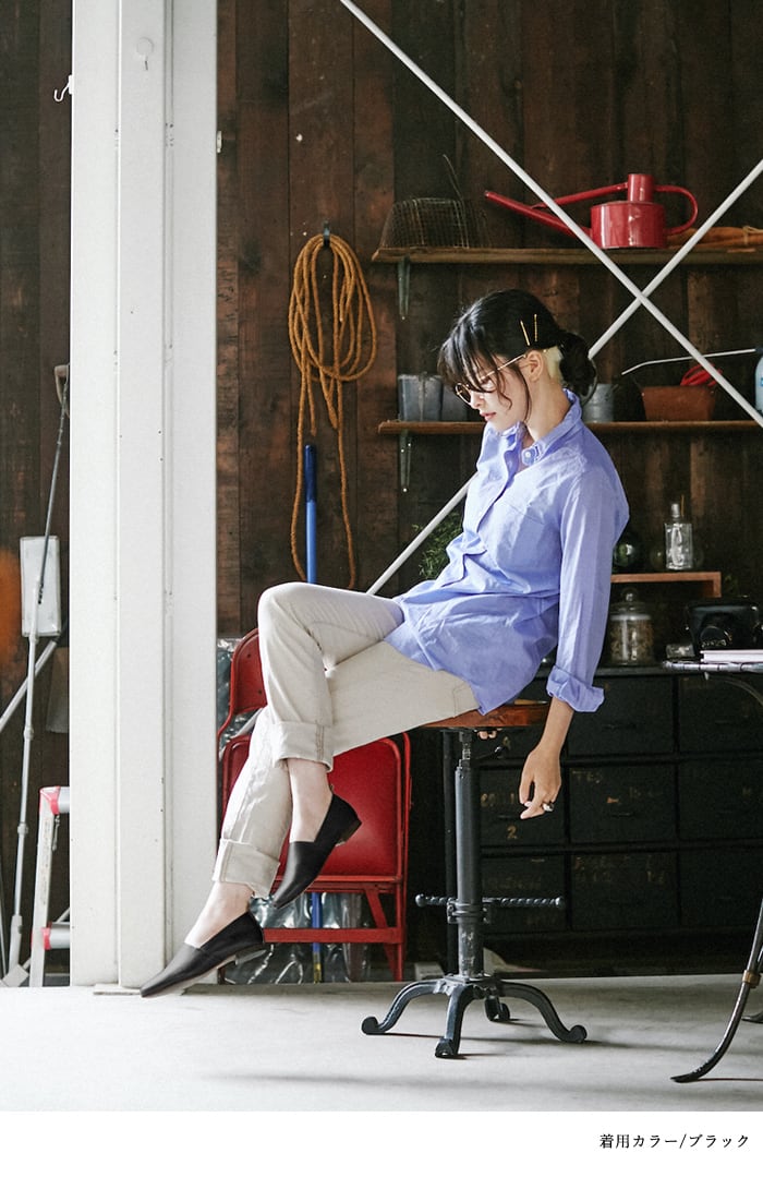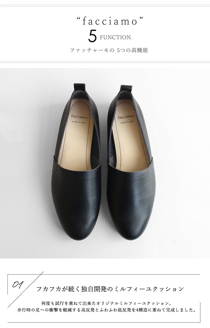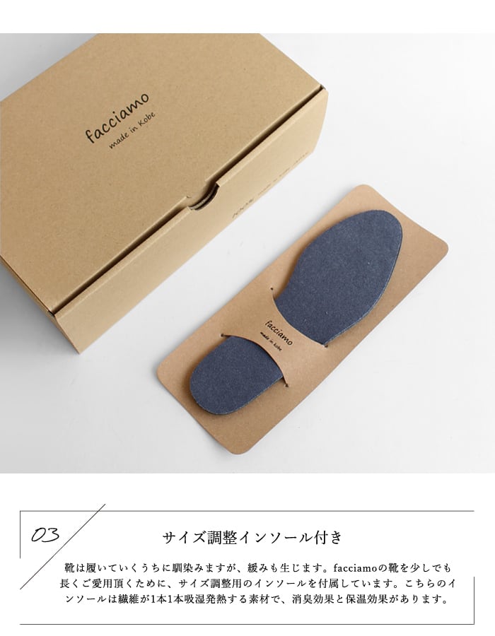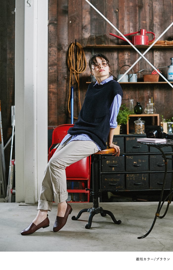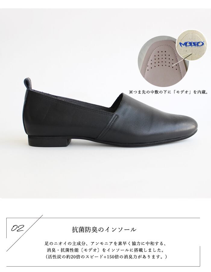 シンプルで足なじみの良い日本製レザーシューズ。インソールには4層に重ねたふわふわクッションを使用し、歩行時の足への衝撃を軽減。気になる消臭・抗菌性能も搭載しています。